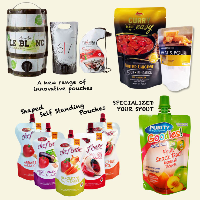 - With increased usage of modern spout pouches fast replacing glass bottles in today's marketplace, they are becoming very successful in providing a packaging solution that not only reduces transport costs, but also give a high quality printed product to display on a shelf in all shapes and forms.