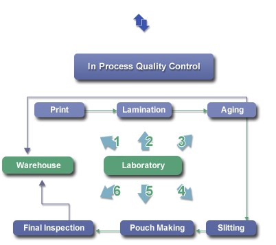 Throughout the manufacturing process, from the point where raw materials are received, to finished products being dispatched, all processes are closely monitored. Within our advanced and well-equipped in-house laboratory, HTD Packaging’s Quality Assurance team members check and double check each manufacturing process. The diagram shows some of the quality checking processes required in different departments.